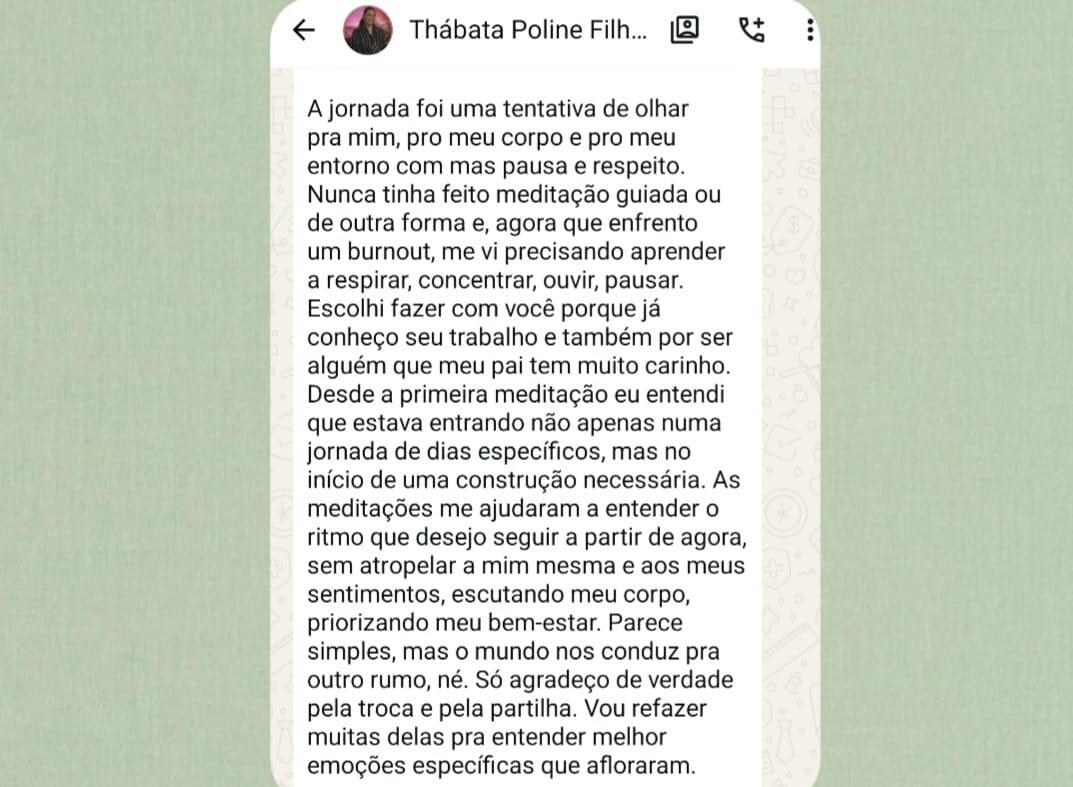 Não deixe para cuidar de você "quando sobrar tempo". O tempo aparece quando decidimos priorizar o que é essencial. Eu estou aqui para te guiar de volta para a sua paz.